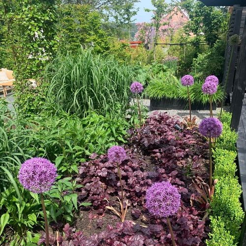 Här fanns mest en sluttande gräsmatta och familjen ville ha en modern, stilren trädgård som matchade det arkitektritade kedjehuset från 60-talet. Här har skapats rumslighet med hjälp av häckar, spaljéer och växter. Köksträdgård, eldfat och vattenblänk har fått sina platser. Denna delen av trädgården ligger närmast huset. På andra sidan häcken finns en stor del av trädgården som har en mer naturlig känsla med hängbjörk, fruktträd och prydnadsträd. Trädgården anlades av kunden själv hösten 2020 enligt mina ritningar, jag levererade växterna och satte ut dem och de planterades ned av kunden själv.